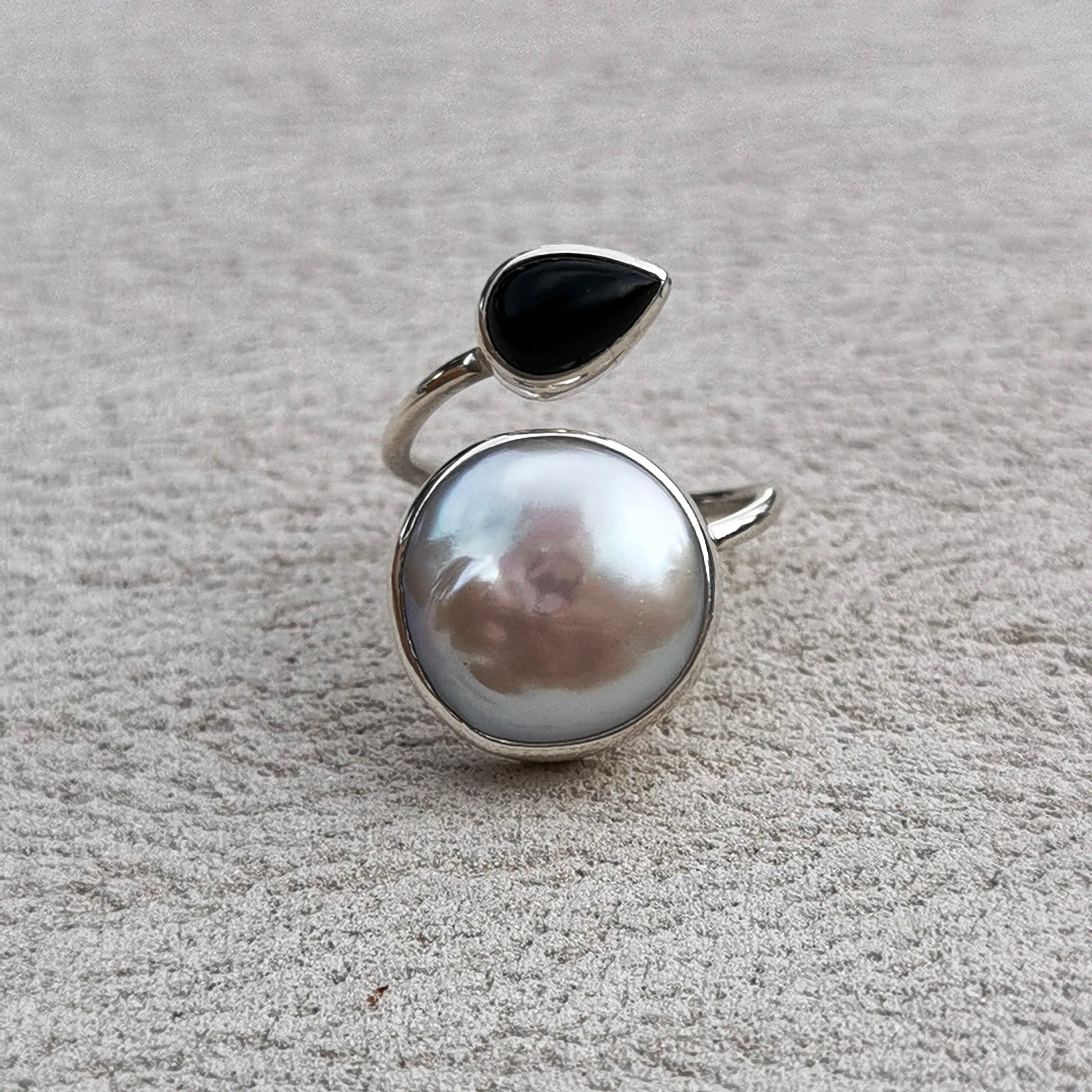 Black onyx and fresh water pearl set in 925 silver. Adjustable size 17-18mm